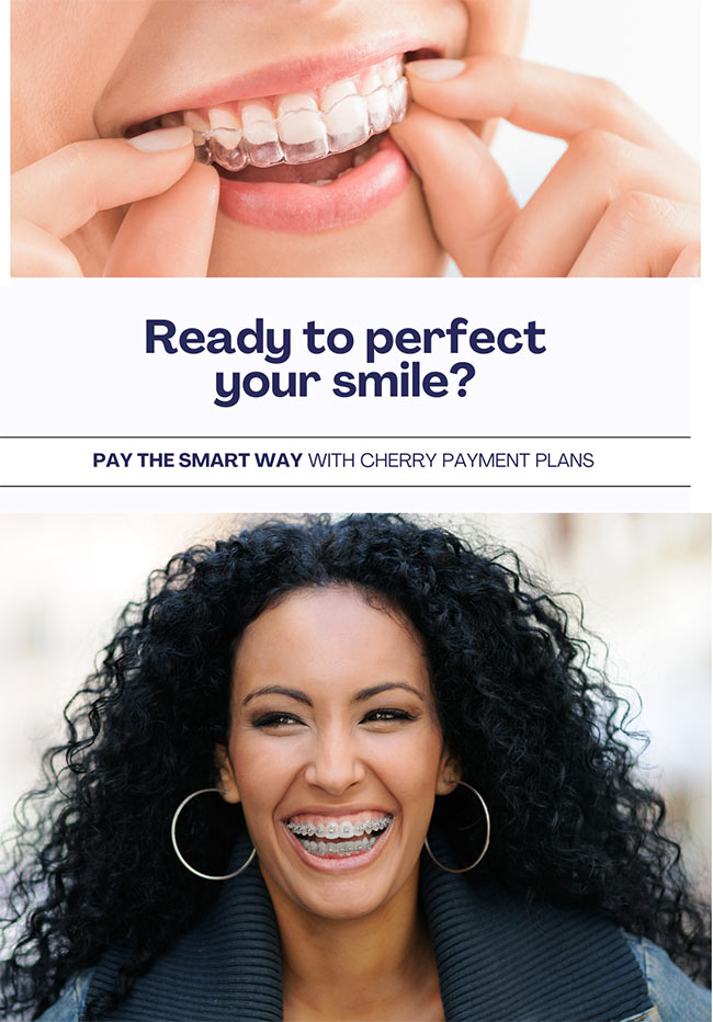 There are many flexible and affordable payment plans to choose from, including interest-free in-office financing for orthodontic treatment over the treatment duration, after the required down payment. We also offer family discounts, and flexible financing through Cherry!